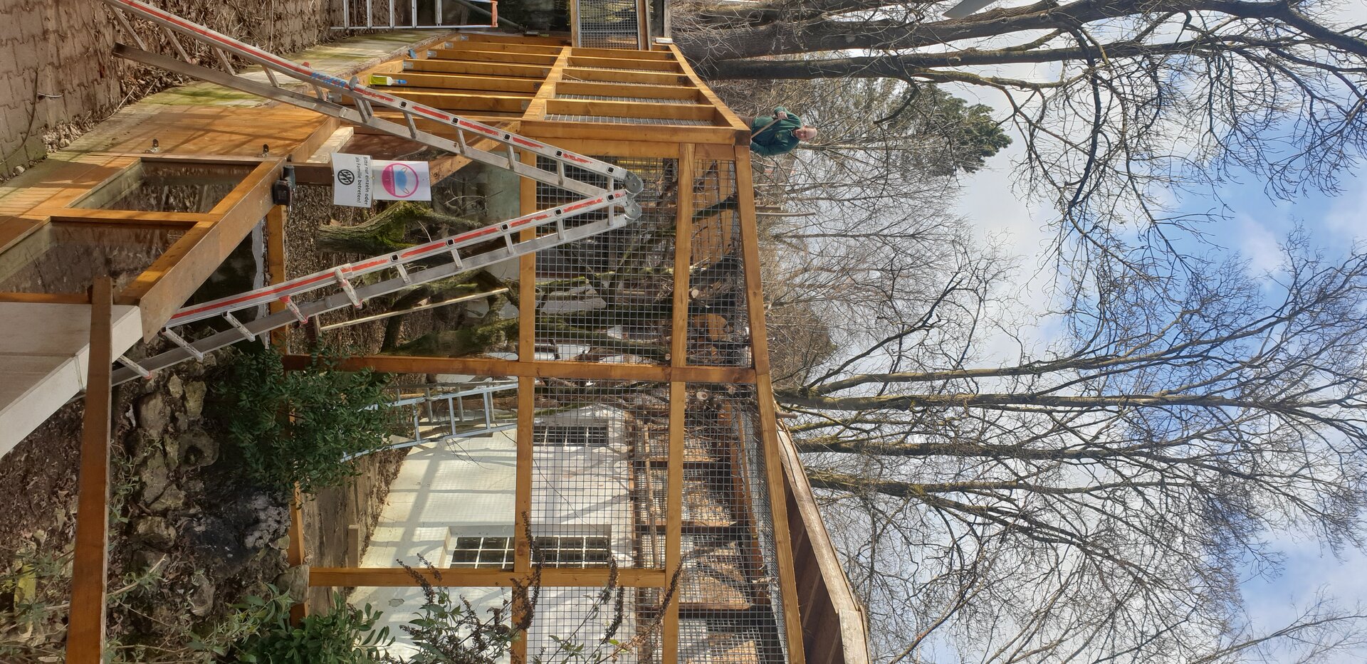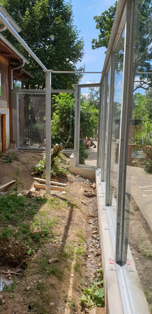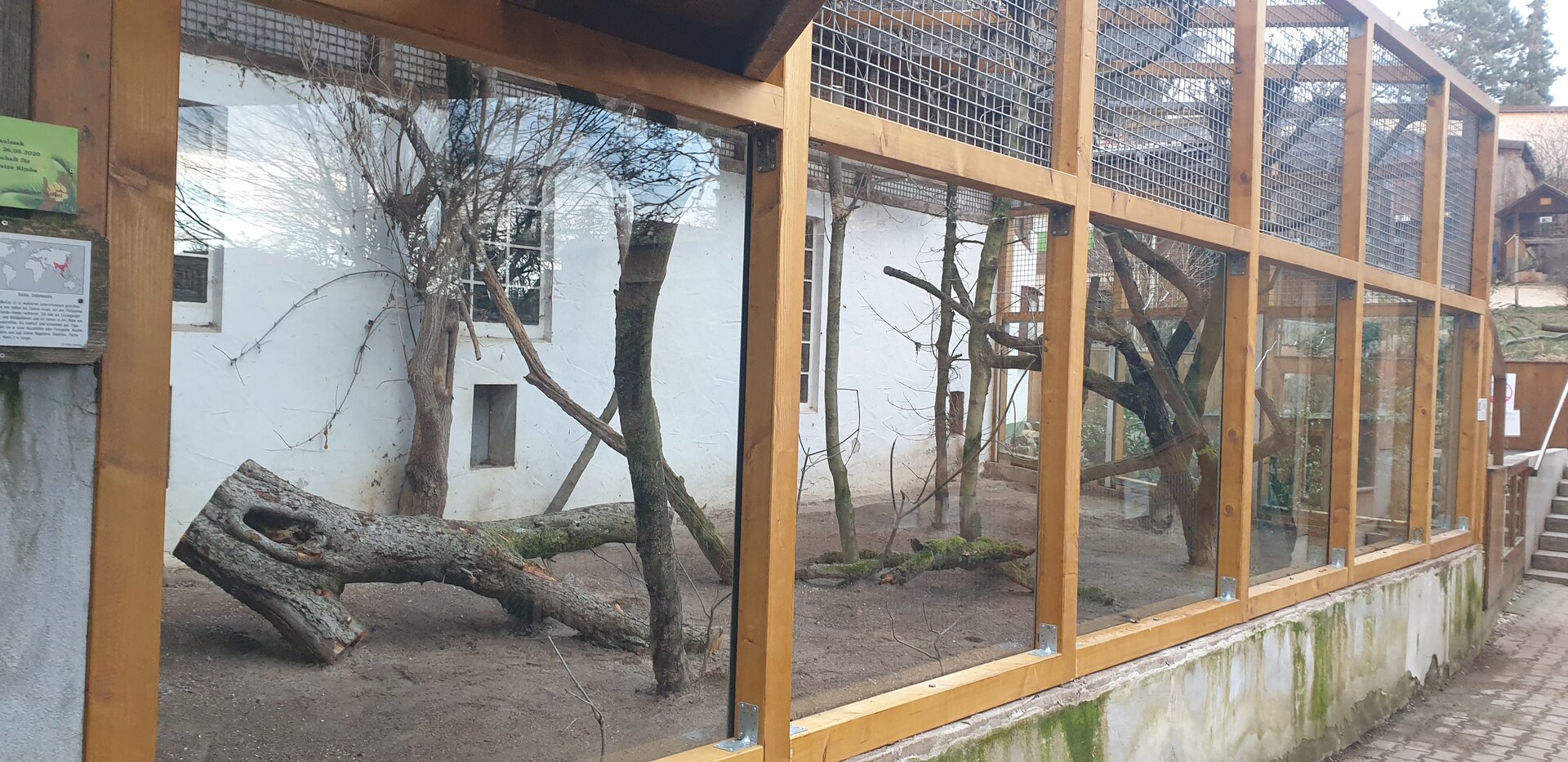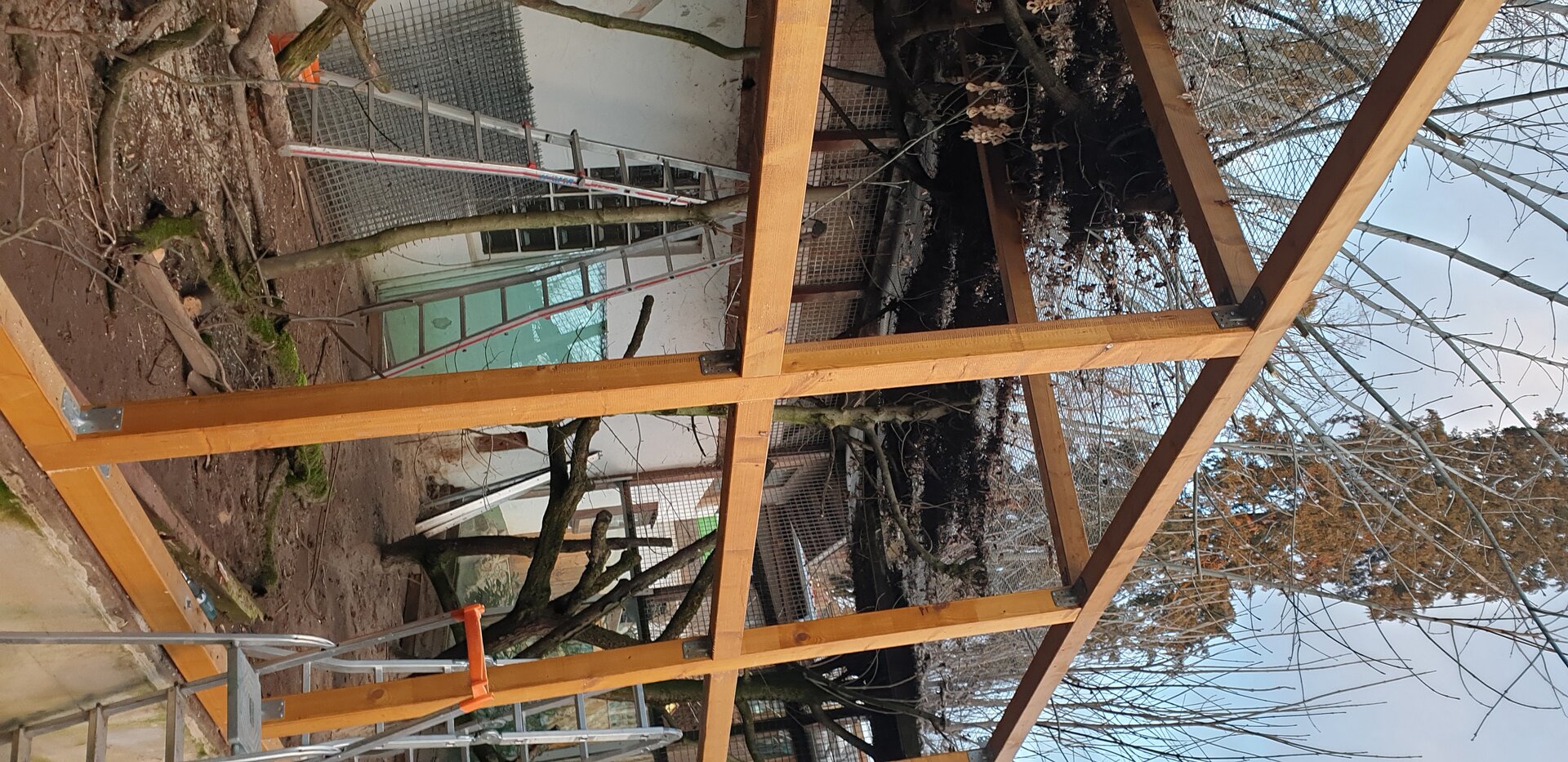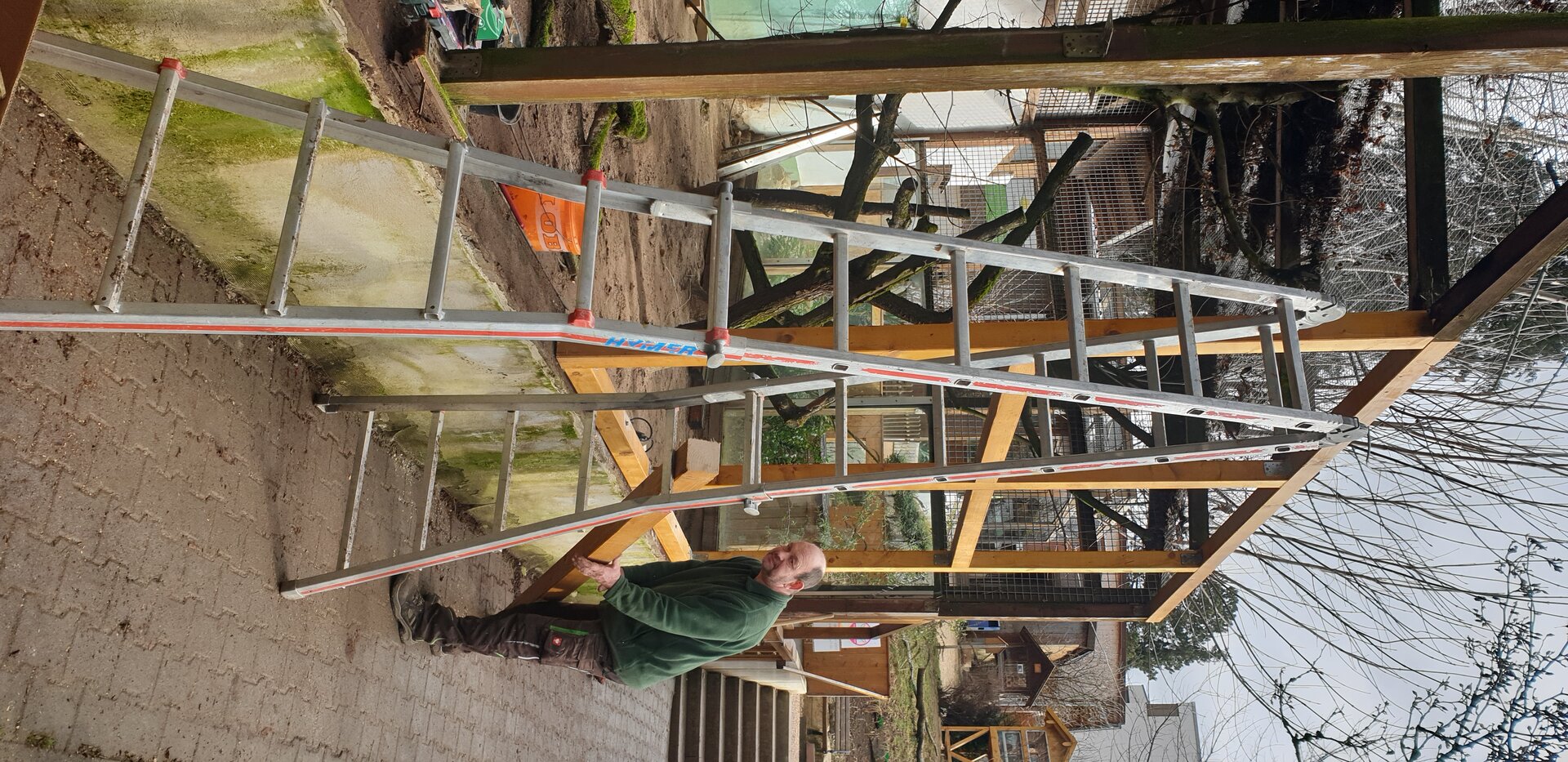 ...heute (14.02.2022) wurde mit der Renovierung des Außengeheges der Servale begonnen, Glas und Gitter wurden entfernt. Nachdem am zweiten Tag die Vorderfront und die Dachsparren erneuert wurde, kam am dritten Tag die Seite dran. Am letzten Tag wurden Gitter montiert, die Glasscheiben eingestzt, Bäume die oben durch das Gitter wuchsen geschnitten und das Laub runtergeblasen. Jetzt kann man auf den Dachsparren wieder gehen. Dadurch wurde das Gehege wieder schön hell. Innen kam ein neuer Baumstamm rein. Dann das Gehege gereinigt, die Scheiben geputzt und der Serval durfte am Abend noch ein paar Runden in seinem fast neuen Gehege laufen.